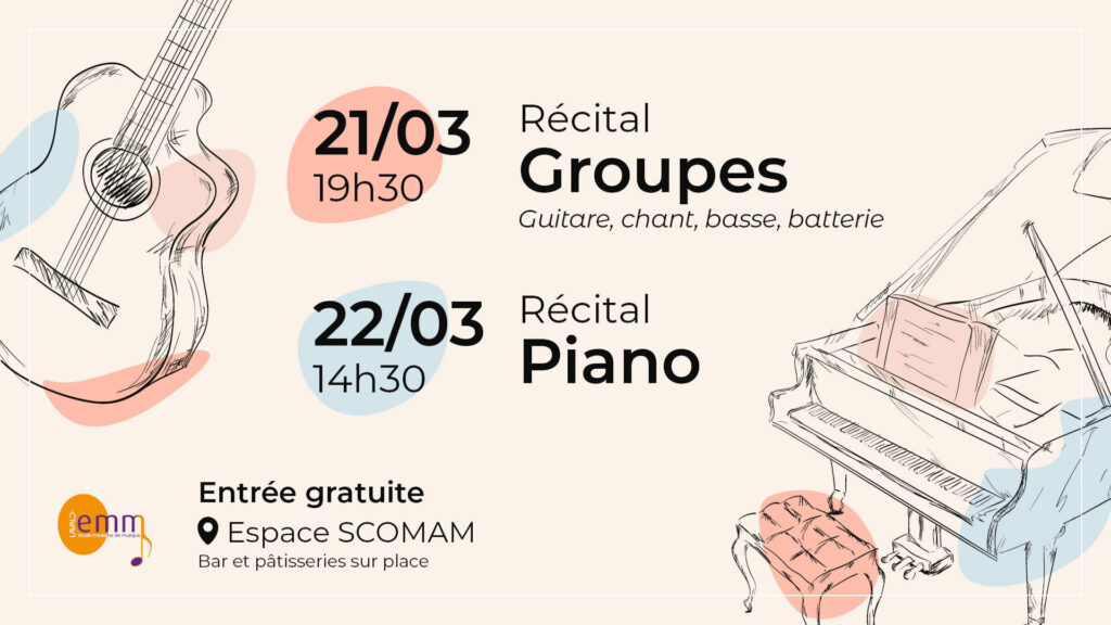 Rendez vous le 15 et 16 Mars à l’espace SCOMAM pour nos récitals de musique (chant, guitare, basse, batterie, piano).
